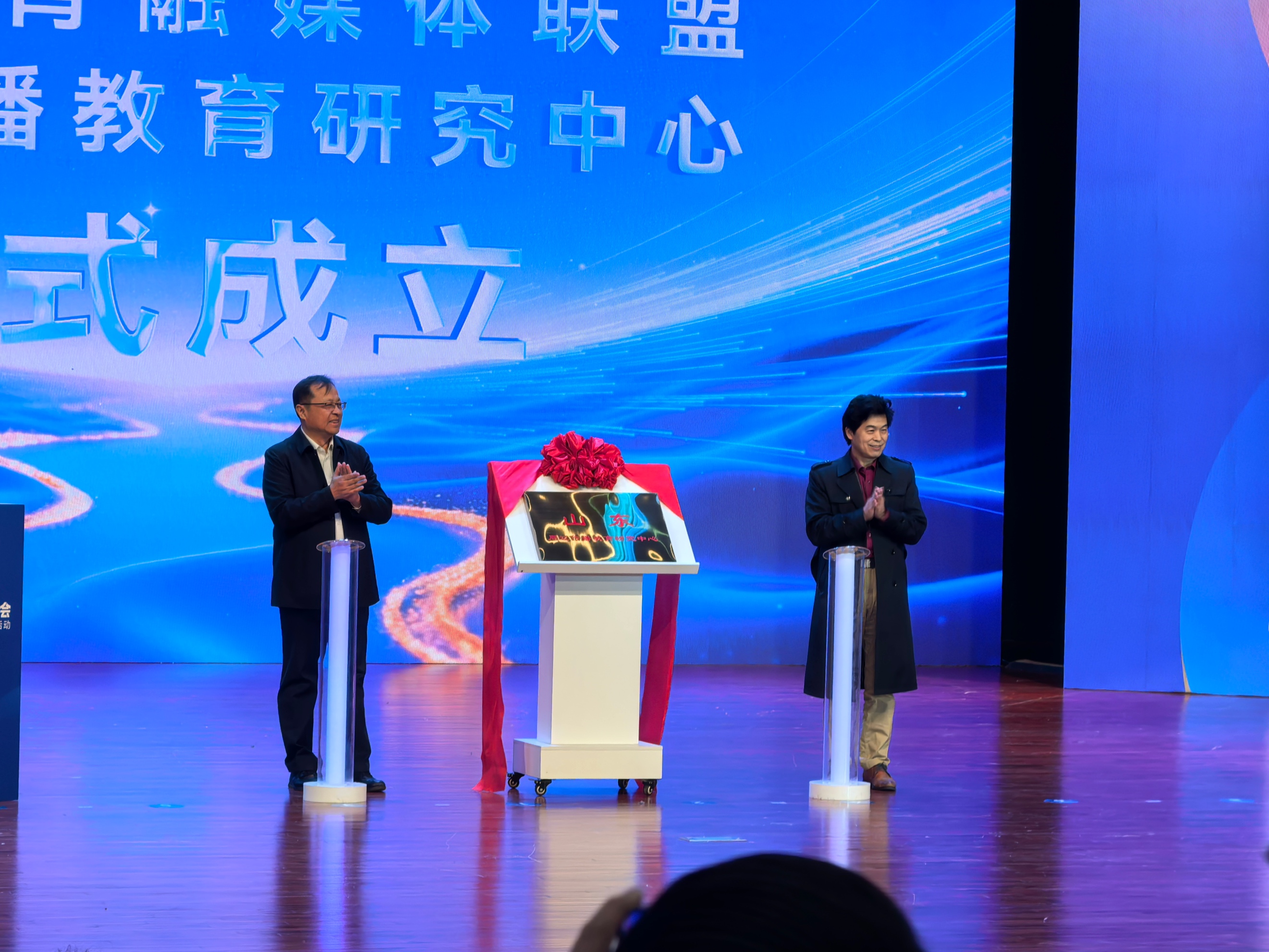 山东周边传播教育研究中心揭牌发表时间:2025-11-25 19:55 11月25日上午,山东周边传播教育研究中心在青岛揭牌。教育部宣传教育中心主任黄兴胜、山东省教育厅副厅长孙晓筠、山东教育电视台台长王上和山东省高等教育管理科学研究会、沿黄九省融媒体联盟的负责人及其成员参加了揭牌仪式。