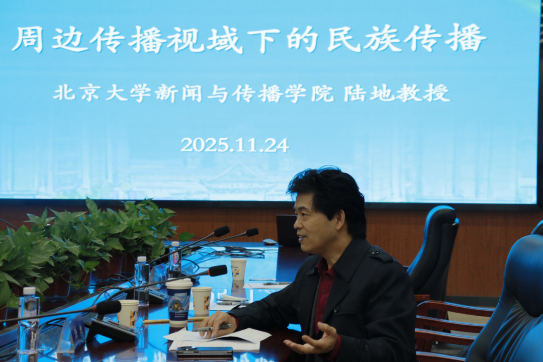 陆地教授应邀到云南民族大学做学术讲座发表时间:2025-11-30 22:53 2025年11月24日,由云南民族大学文学院主办的“周边传播视域下的民族传播”主题讲座在丰泽院A区101会议室圆满举行。本次讲座由文学院院长王国旭主持,特邀北京大学教授、周边传播理论提出者陆地教授担任主讲嘉宾。讲座围绕周边传播理论的提出背景及其具体内容,为在场师生清晰阐释了该理论的核心内涵。